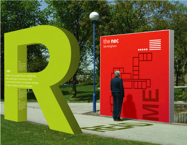 Creation of a big and bold design solution to help people find their way around Birmingham’s National Exhibition Centre – the UK's largest exhibition space. Fun, Witty, British and Alternative.
